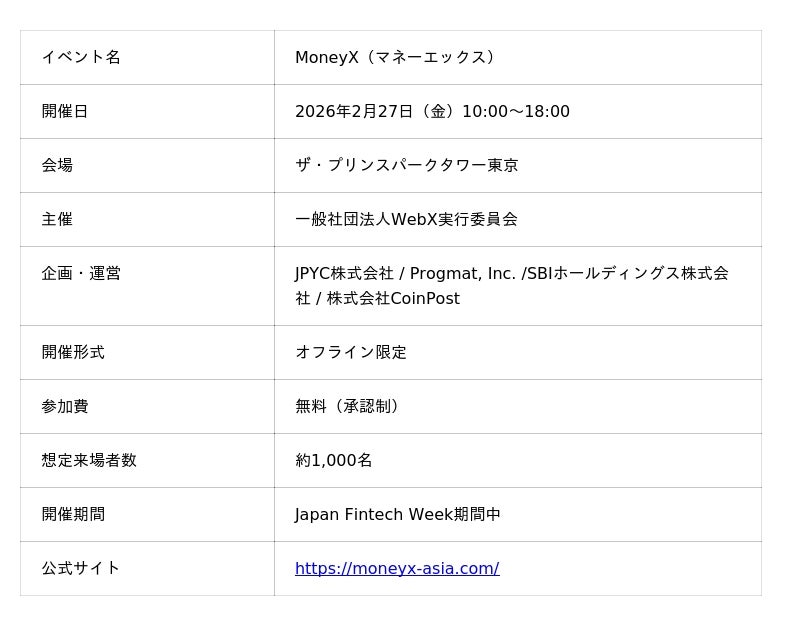 - 開催日:2026年2月27日(金)- 開催場所:ザ・プリンスパークタワー東京- 主催:一般社団法人WebX実行委員会- 企画・運営:JPYC株式会社 / Progmat, Inc. / SBIホールディングス株式会社 / 株式会社CoinPost