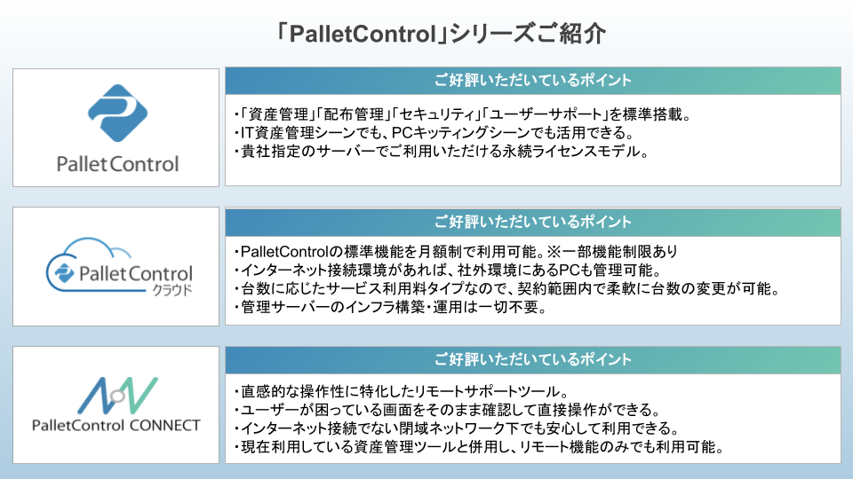 PalletControlは「IT管理者の思いを現実に」をコンセプトに、JALのPC展開作業の自動化を図るため、JALデジタルが開発し、1996年より一般販売を開始したIT資産管理ソフトウェアです。PCキッティングやPC設定変更作業など、PC運用管理業務において人手と時間を要する作業を「自動化」することで、PC運用のコストダウンや効率化、セキュリティの維持などに貢献します。