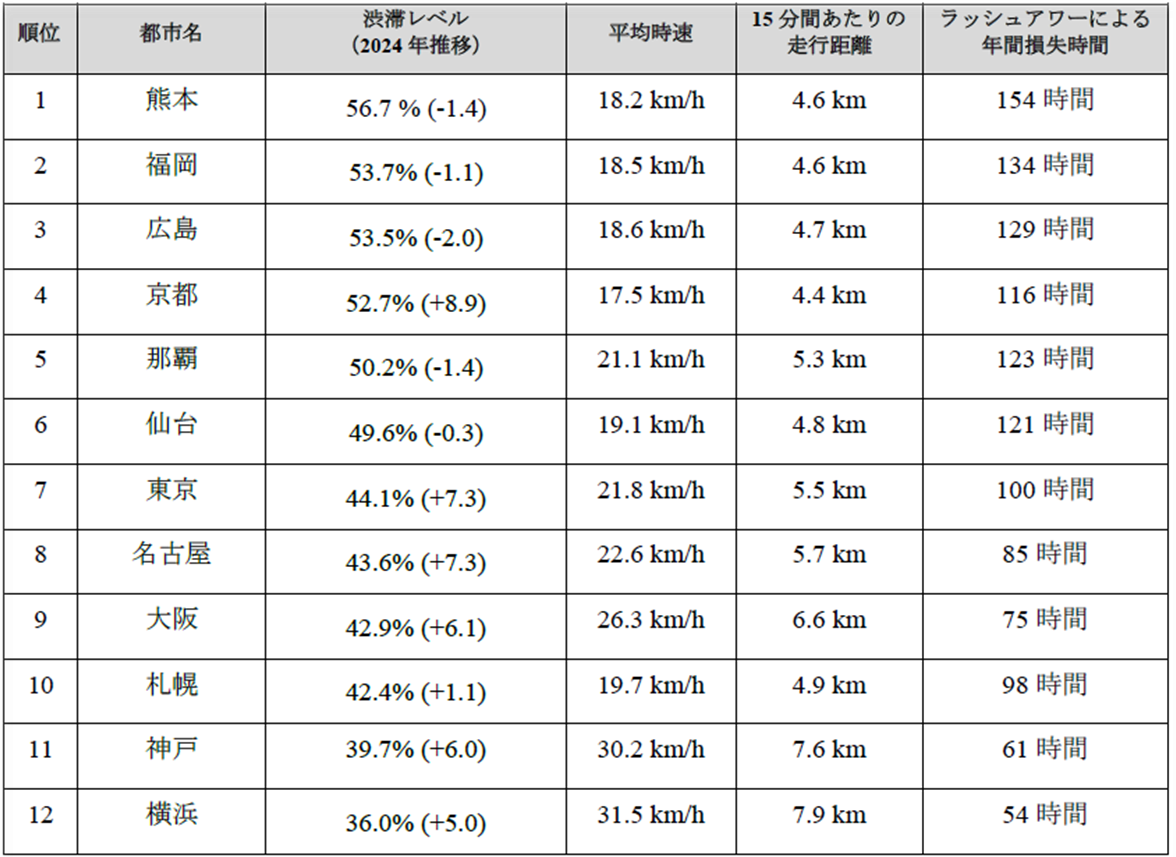 - 熊本: 年間平均渋滞レベル56.7%を記録し、国内12都市の中で最も深刻な状況にあることが明らかとなりました。これはアジア地域においても第13位に相当する水準であり、ラッシュアワーによる年間損失時間は154時間に達しています。2024年度の調査から高い渋滞レベルでランクインしている同都市の要因としては、