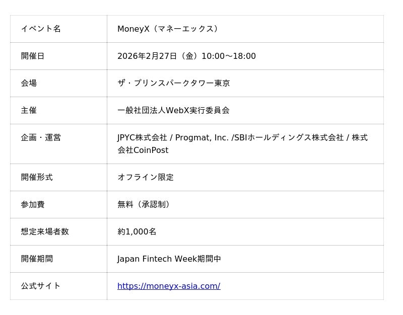 - 開催日:2026年2月27日(金)- 開催場所:ザ・プリンスパークタワー東京- 主催:一般社団法人WebX実行委員会- 企画・運営:JPYC株式会社 / Progmat, Inc. / SBIホールディングス株式会社 / 株式会社CoinPost