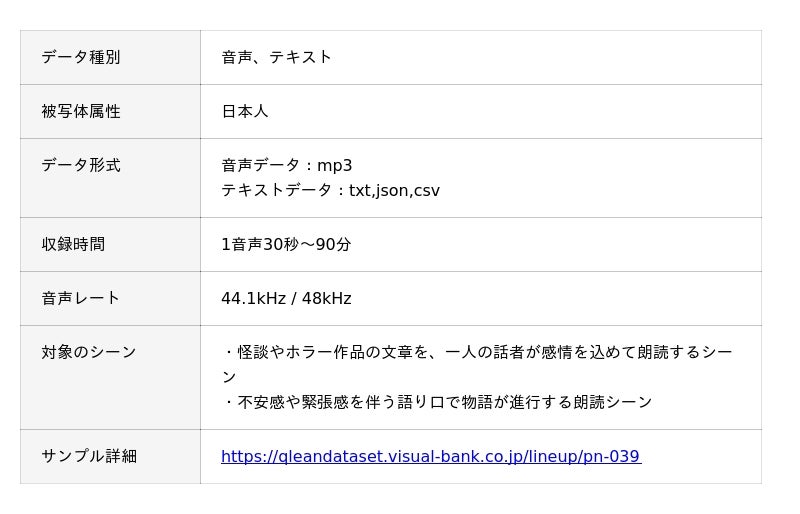Visual Bank株式会社(東京都港区、代表取締役CEO:永井真之)は、傘下の株式会社アマナイメージズを通じて展開するAI学習用データソリューション「Qlean Dataset(キュリンデータセット)」において、ASR(自動音声認識)、音声理解、LLM(大規模言語モデル)などの音声・言語系AI開発および研究用途に向けた「日本語・1話者・怪談系テーマの朗読音声コーパスとトランスクリプト」の提供を開始しました。