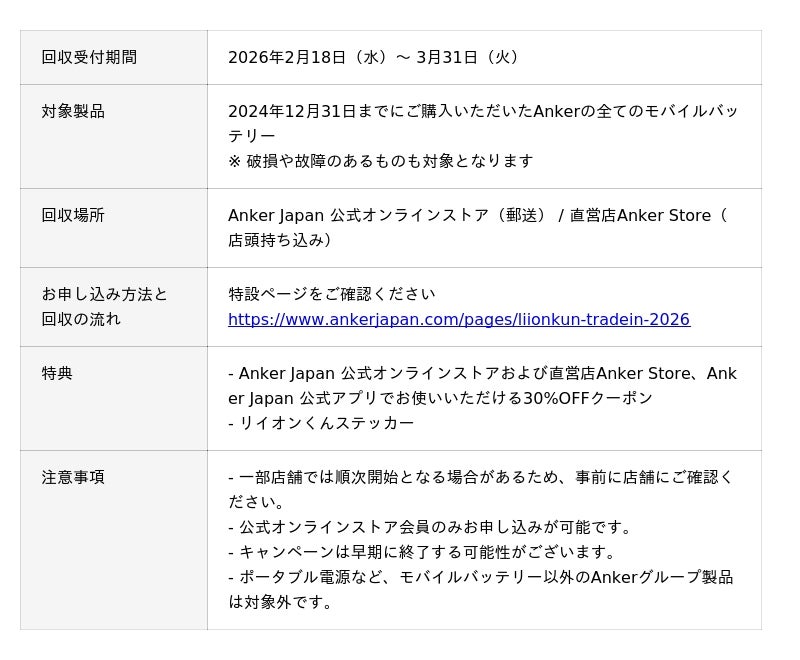 リイオンくんの誕生を記念し、対象のモバイルバッテリーを下取りに出していただいた方に、Anker Japan 公式オンラインストアおよび直営店Anker Store、Anker Japan 公式アプリでご使用いただける30%OFFクーポンをプレゼントいたします。