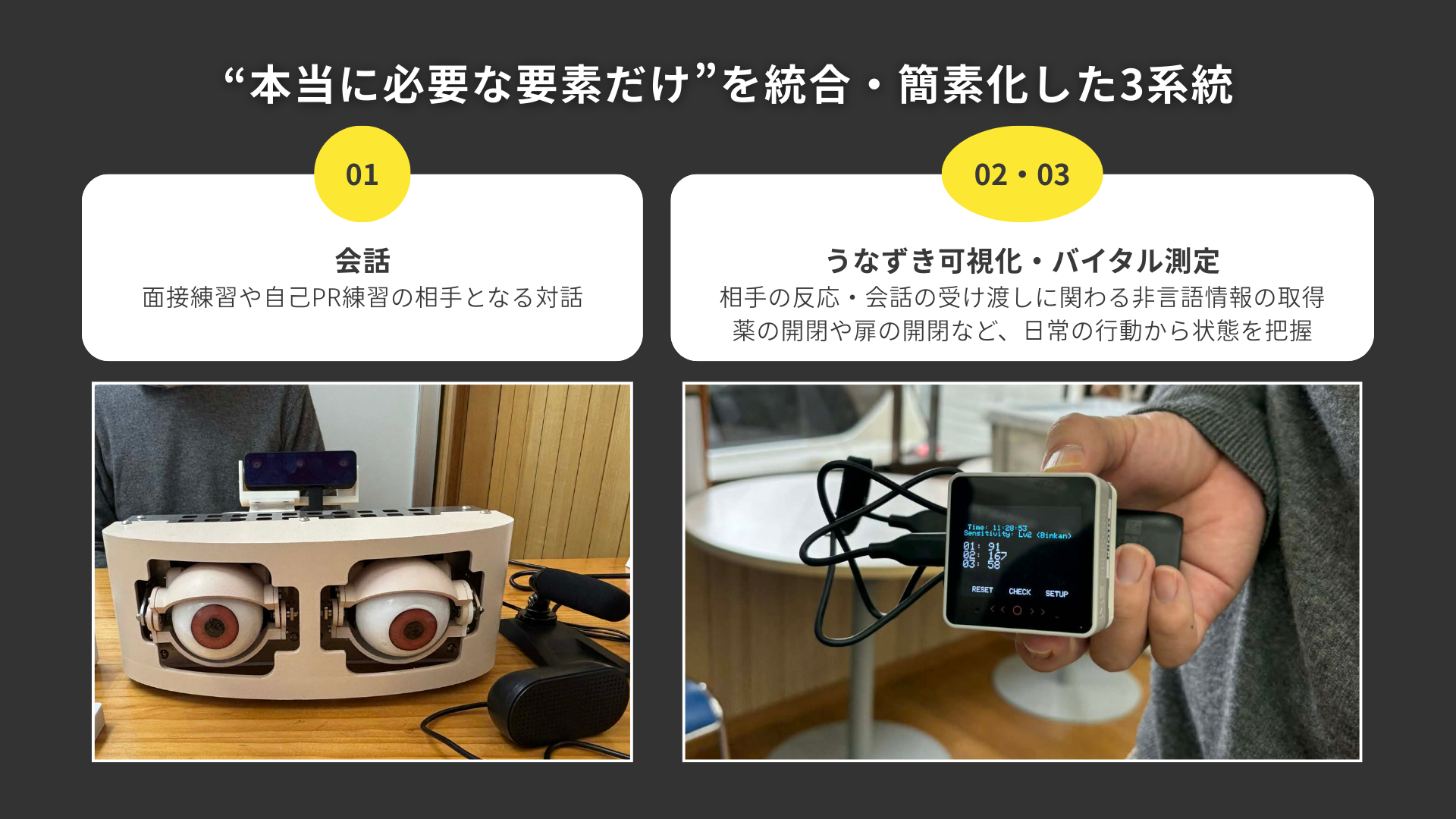 - うなずき可視化(相手の反応・会話の受け渡しに関わる非言語情報の取得)- 会話(面接練習や自己PR練習の相手となる対話)- バイタル測定(薬の開閉や扉の開閉など、日常の行動から状態を把握)