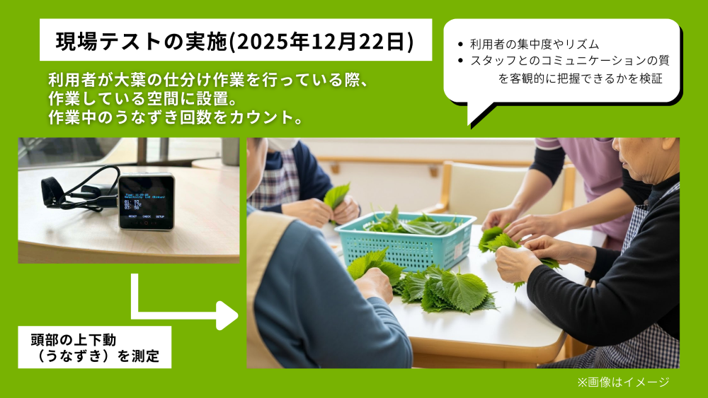 実施内容: 実際の利用者が活動する時間帯のうち11:00~12:00の1時間、利用者が大葉の仕分け作業を行っている際、作業している空間に設置し、頭部の上下動(うなずき)を測定。