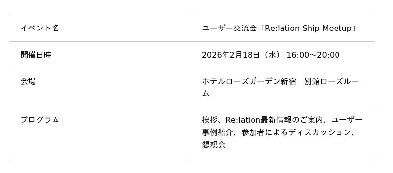 コミュニケーションプラットフォ-ム『Re:lation(リレーション)』を提供し、6,000社以上(※1)の導入実績を誇る株式会社インゲージ(本社:大阪府大阪市、代表取締役社長:和田 哲也、以下インゲージ)は、2026年2月18日(水)、ユーザー交流会「Re:lation-Ship Meetup」を東京・新宿にて開催いたしました。
