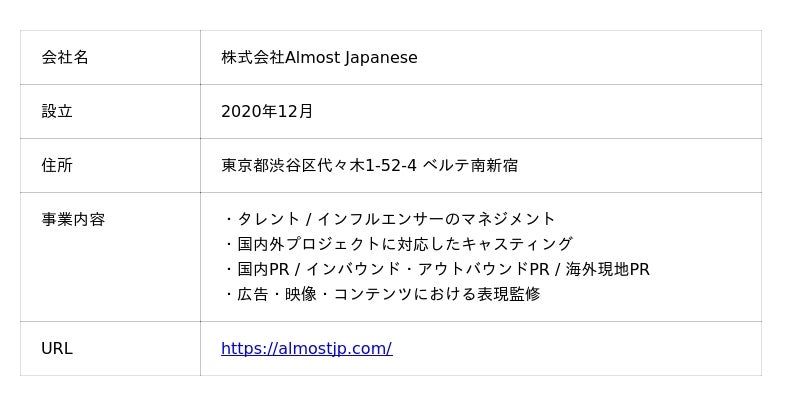 Almost Japaneseは、インフルエンサーのマネジメント機能とキャスティング機能の双方を兼ね備えた企業です。日本を拠点としながら、グローバルで多様なバックグラウンドを持つタレントやインフルエンサーと継続的な関係性を築き、国内外のさまざまなプロジェクトに最適なキャスティングを提供しています。