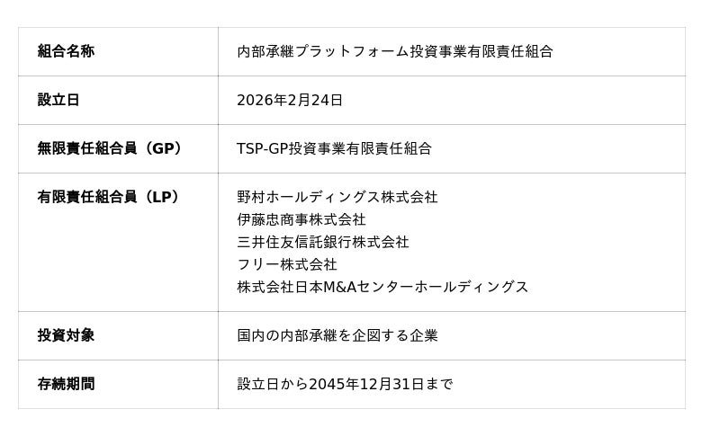 株式会社日本M&Aセンターホールディングス(以下、当社 / 本社:東京都千代田区 / 代表取締役社長:三宅 卓)は、野村ホールディングス株式会社(本社:東京都千代田区 / 代表執行役社長 グループCEO:奥田 健太郎)、伊藤忠商事株式会社(本社:東京都港区 / 代表取締役社長COO:石井 敬太)、三井住友信託銀行株式会社(本社:東京都千代田区 / 取締役社長:大山 一也)とともに内部承継プラットフォーム投資事業有限責任組合(以下、本組合)への参画を決定したことをお知らせいたします。