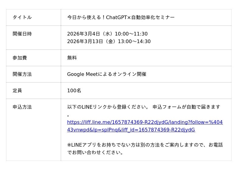 ワークキャリア株式会社(所在地:東京都港区、代表取締役:秋吉正樹)は3/4(水)10:00と3/13(金)の13:00より、無料のオンラインセミナー「今日から使える!ChatGPT×事務自動化セミナー」を開催いたします。