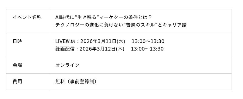 AI時代に“生き残る”マーケターの条件とは?テクノロジーの進化に負けない“普遍のスキル”とキャリア論」を開催いたします。