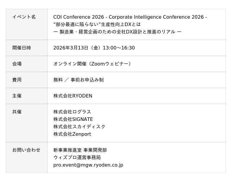 株式会社RYODENは、各方面に専門知識を有する4社(株式会社ログラス、株式会社SIGNATE、株式会社スカイディスク、株式会社Zenport)と当社ウィズプロとの共催で「COI Conference 2026 - Corporate Intelligence Conference 2026 -“部分最適に陥らない”生産性向上DXとは ー 製造業・経営企画のための全社DX設計と推進のリアル ー」を2026年3月13日(金)に開催します。