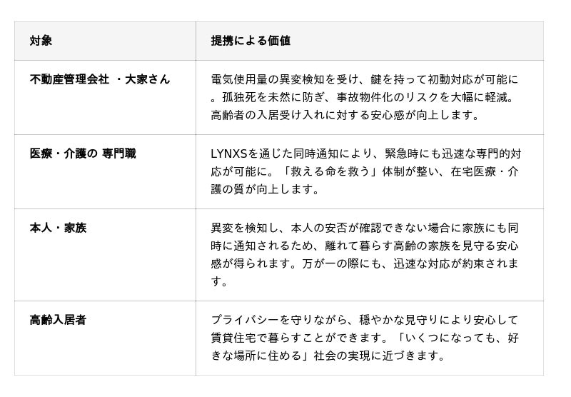 本提携により、LYNXSの新機能としてR65不動産が提供する電力使用量をモニタリングする見守りサービス「らくもり」をLYNXSの多職種連携プラットフォームと連動させ、不動産管理会社・大家による迅速な初動対応と、医療・介護者や本人家族への同時通知を可能にします。さらに、初動対応にあたった不動産管理会社・大家がLYNXSを通じて現場の状況を報告することで、医療・介護の専門職やご家族がより早く適切な対応を取ることができます。これにより、高齢入居者の孤独死の防止と、事故物件化のリスク軽減を同時に実現します。