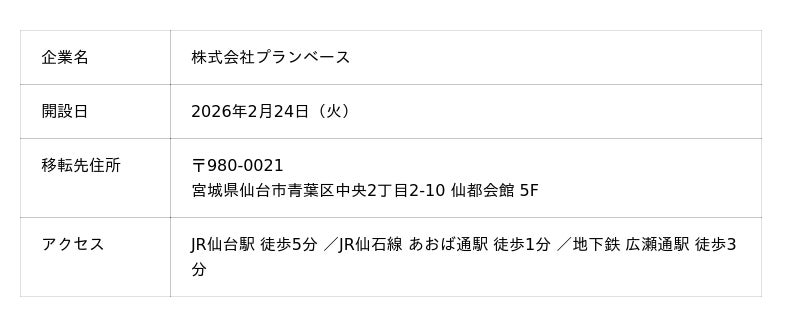 株式会社プランベースは2026年2月24日(火)、 宮城県仙台市青葉区中央2丁目2-10 仙都会館 5Fへ仙台オフィスを開設します。