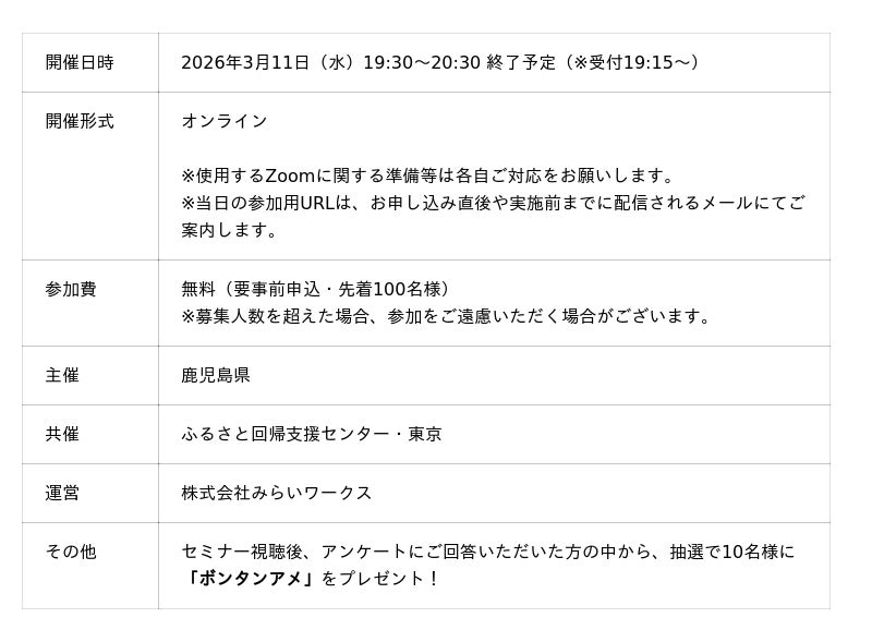 鹿児島県から受託した事業の一環で、オンライン移住セミナーを開催します。