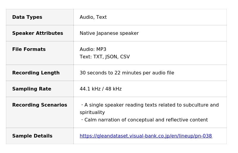 Visual Bank Inc. (Minato-ku, Tokyo; CEO: Saneyuki Nagai) has launched a new dataset under its AI training data solution, Qlean Dataset, through its subsidiary amanaimages Inc. The newly released dataset, titled Japanese Single-Speaker Read Speech Corpus on Subculture and Spiritual Themes with Transcripts, is designed for use in Automatic Speech Recognition (ASR), speech understanding, and speech-language foundation model development.