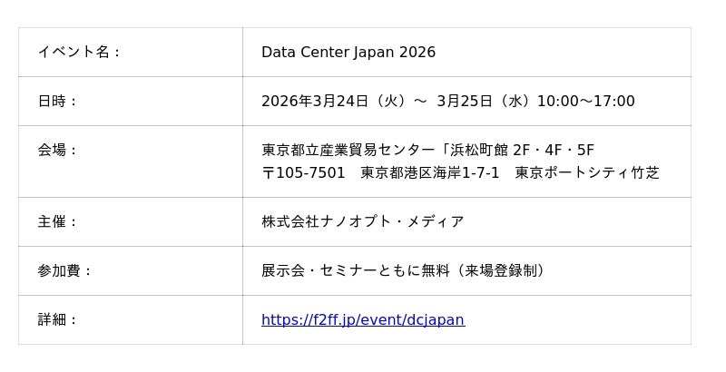 高千穂交易株式会社(本社:東京都新宿区、代表取締役社長:井出尊信、証券コード:2676、以下「当社」)は、2026年3月に開催される株式会社ナノオプト・メディア主催のData Center Japan 2026に出展することを発表します。当社は、社会インフラとして重要性を増すデータセンターの安定稼働を支えるため、物理的な侵入対策からサイバー攻撃への備えまで、包括的な安全を確保するトータルセキュリティソリューションをご提案します。