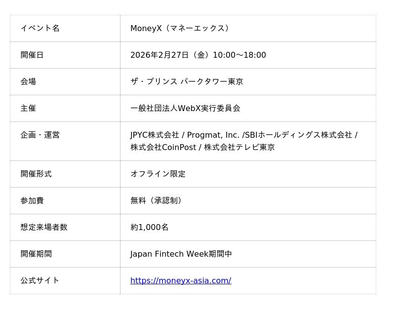 - 開催日:2026年2月27日(金)- 開催場所:ザ・プリンス パークタワー東京- 主催:一般社団法人WebX実行委員会- 企画・運営:JPYC株式会社 / Progmat, Inc. / SBIホールディングス株式会社 / 株式会社CoinPost / 株式会社テレビ東京