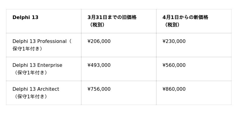 Delphiは発売31周年を記念して、2026年2月16日から3月16日までEショップ限定で、Delphi、C++Builder、RAD Studio を特別価格で提供する『Delphi 31周年記念キャンペーン』を実施しています。対象製品は、RAD Studio / Delphi / C++Builder 13 FlorenceのProfessional、Enterprise、Architect の各エディションです(アカデミックならびにネットワークライセンスは本キャンペーンの対象外です)。