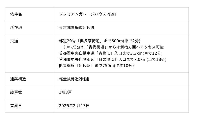 「まちのスキマを、『創造』で満たす。」というパーパスを掲げる、フィル・カンパニーグループ(中核企業:株式会社フィル・カンパニー 代表:外山晋吾 グループ本社:東京都中央区 以下、当グループ)は、2026年2月にプレミアムガレージハウス河辺IIが完成したことをお知らせいたします。
