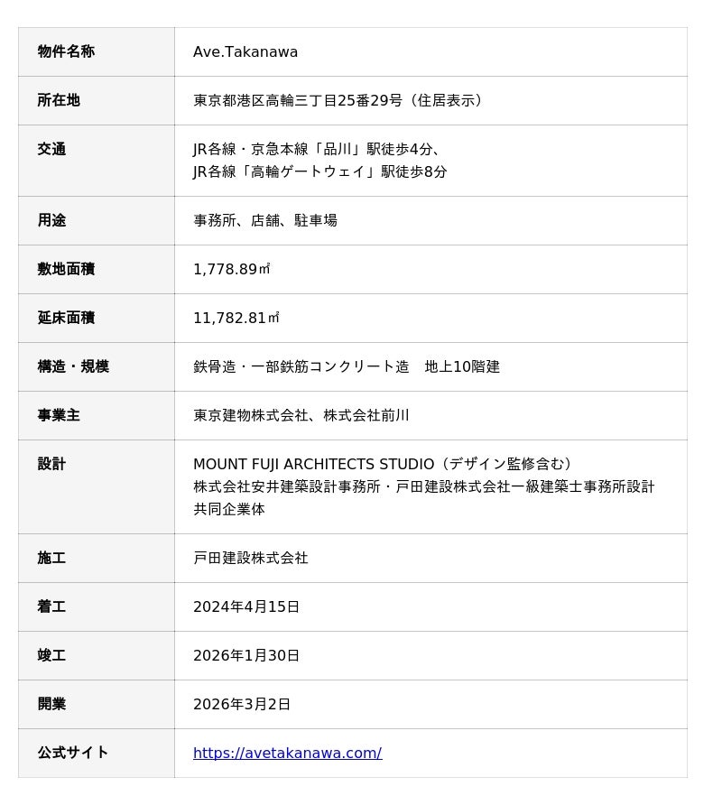 東京建物株式会社は、品川駅高輪口より徒歩4分に位置するオフィスビル「Ave.Takanawa(アベニュータカナワ)」(以下「本物件」)が2026年1月30日に竣工し、同年3月2日に開業することをお知らせします。