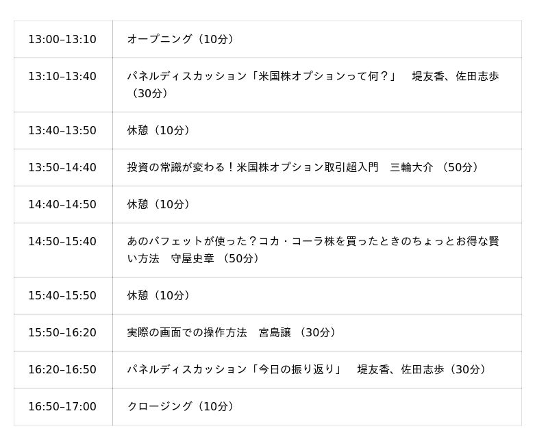 本勉強会は、米国株オプション取引の完全初心者を前提に設計された実践型プログラムです。オプション取引の基本的な考え方や用語解説に加え、専門家による実例を交えた戦略解説、さらにウィブル証券の実際の取引画面を用いた操作デモまでを一日で体験できます。