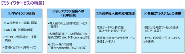 ミツイワは、IT・NWインテグレータとして基幹業務を支えて参りました。FsBPは、1対1接続はもちろんのこと、1対多接続や更に事務用PCからの接続活用により、見える化の価値を高めます。その運用を実現するには、セキュリティを考慮したNW構築や、BIツール等の分析環境の構築が重要です。