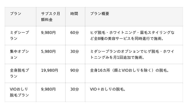ミダシーは「月1回、1時間、1万円で、身だしなみを完璧に。」をコンセプトにした、男性向けのワンストップ美容サロンです。ヒゲ脱毛、ホワイトニング、眉毛スタイリング、ネイルケアなど複数の美容メニューを融合し、男性の身だしなみを一度で整えられる利便性が特徴です。