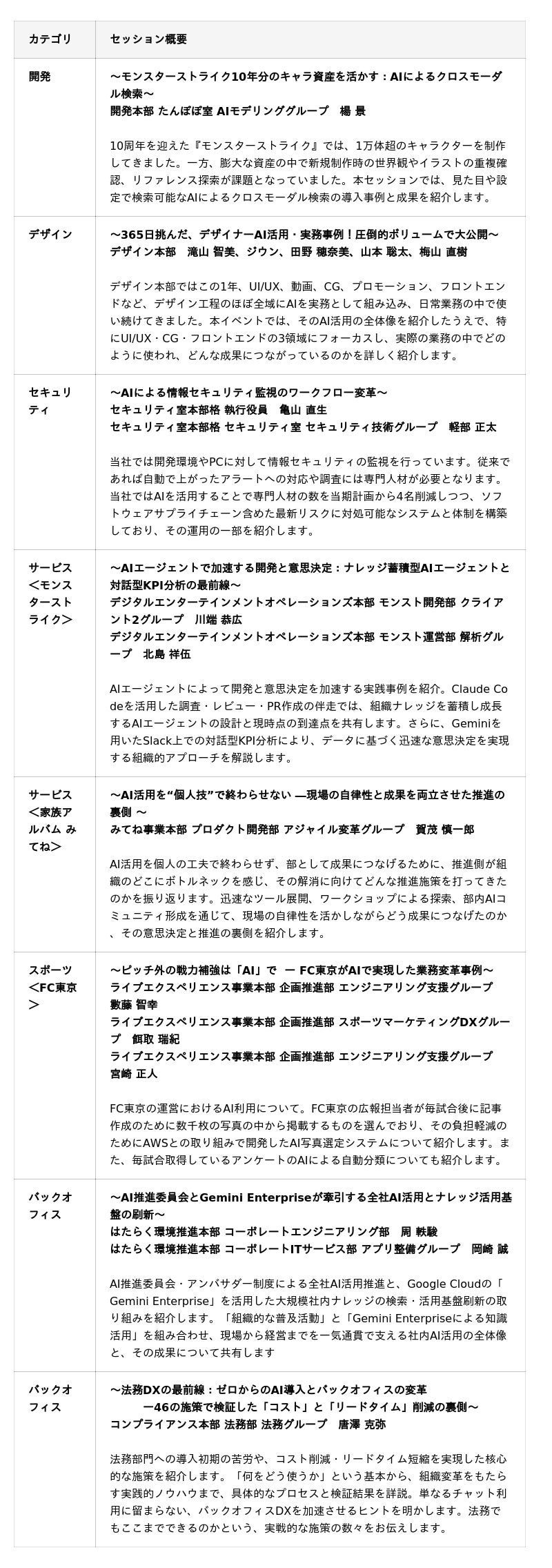 代表の木村より開会を宣言した後、全17本部・23事例の各セッションでは、プロダクト開発からコーポレートまで、各現場で進むAI活用の取り組みを紹介します。例えば、「モンスターストライク」におけるAIによるクロスモーダル検索、デザイン工程の広範囲にAIを組み込んだデザイン本部の実務事例、AIを用いた情報セキュリティ監視の運用変革、FC東京のAI写真選定、法務領域のDX、社内ナレッジ活用基盤の刷新など、職種・領域を横断した具体的な取り組みを公開します。