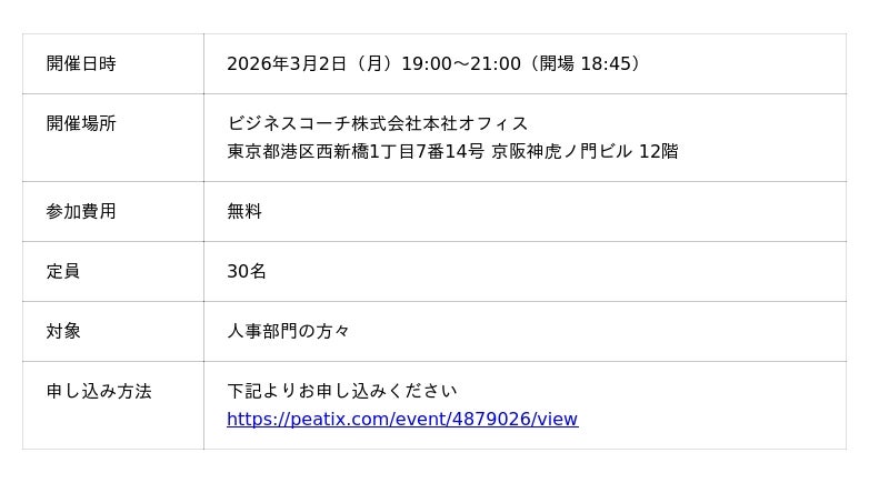 ビジネスコーチ株式会社(本社:東京都港区、代表取締役社長:細川 馨、東証グロース:9562)の子会社であるB-Connect株式会社(本社:東京都港区、代表取締役社長:杉本 博史、以下当社)は、3月2日(月)に、人事図書館 館長 吉田洋介氏と専修大学 特任教授 須東朋広氏をお招きし、当社と人事図書館の共催セミナーを開催いたします。
