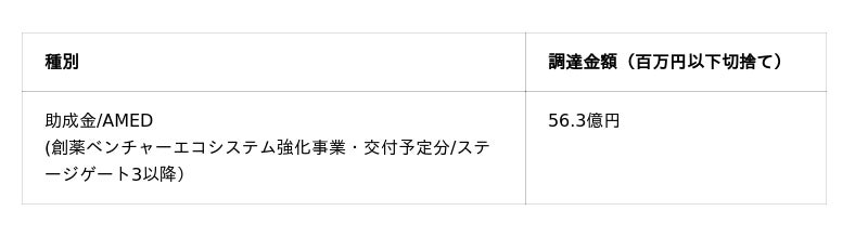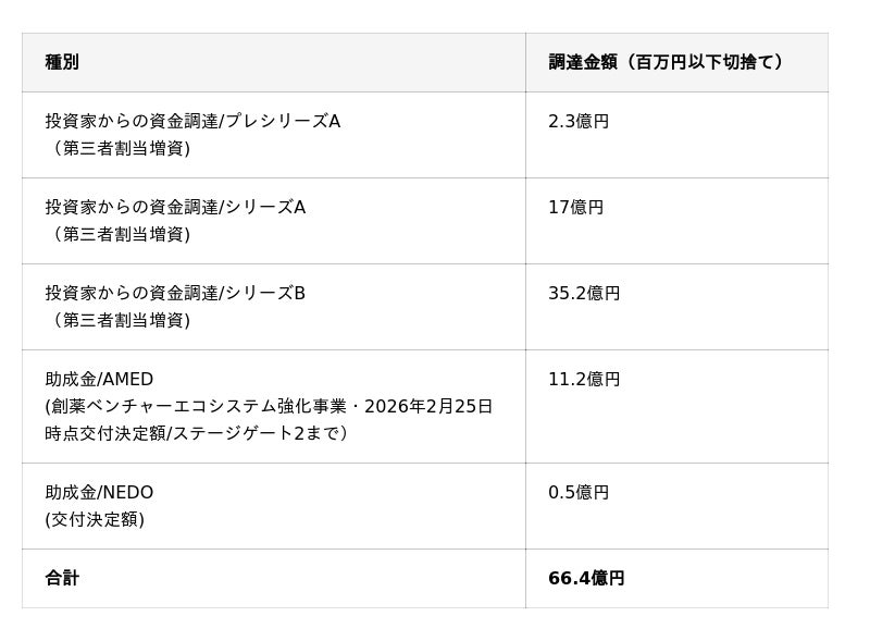 2026年2月までに累計54.6億円の資金調達を実施しています。今回の中間評価通過により、AMEDおよび国立研究開発法人新エネルギー・産業技術総合開発機構(NEDO)からの助成金の合計11.8億円を含めた累計資金調達額は66.4億円となりました。さらに、AMEDの同事業を通じて、今後56.3億円の交付が予定されています。