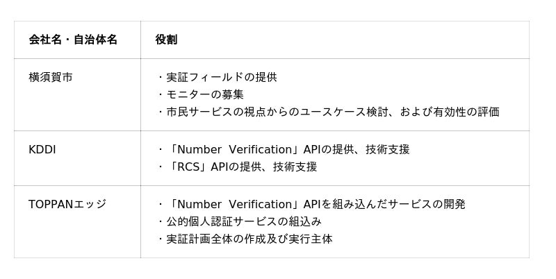本実証では、KDDIが提供する電話番号認証技術「Number Verification」(注1)を、TOPPANエッジが提供するRCS(注2)を活用したメッセージ配信サービスや公的個人認証サービス(JPKI)に組み込み、横須賀市民向けに提供することで、行政と住民とのコミュニケーションにおける有効性を検証します。マイナンバーカード更新の案内や定期健診の受診勧奨通知など、行政通知のデジタル化に電話番号認証技術「Number Verification」を活用することで、オンラインにおけるなりすましや不正利用のリスクという行政課題の解決が期待できます。