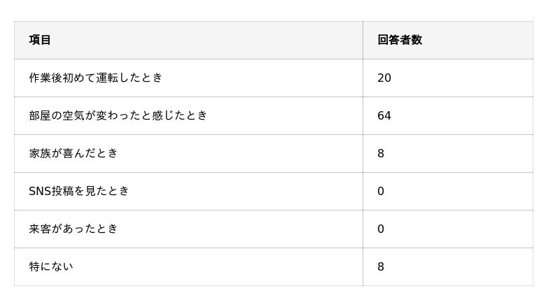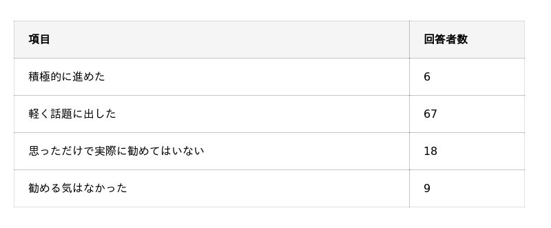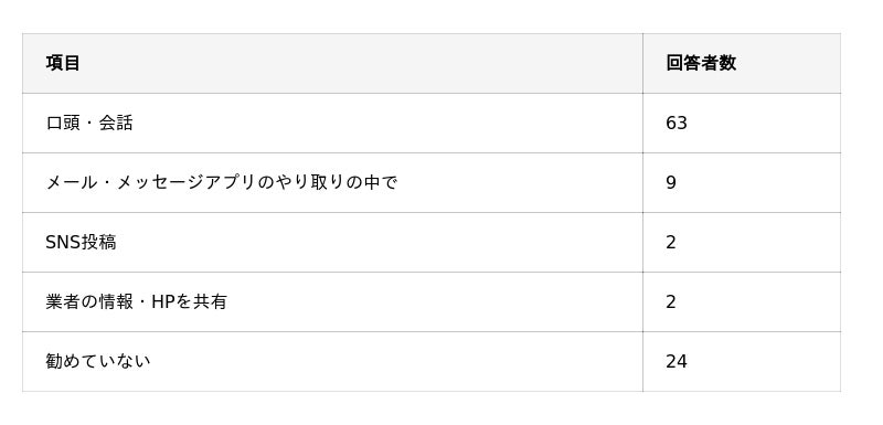 - 7割を超える人がエアコンクリーニングを他人に勧めたいと思ったことがある。- エアコンクリーニングを他人に勧めたいと思った瞬間は「部屋の空気が変わったと感じたとき」が最も多い。- エアコンクリーニングを他人に勧めたいと思った人の内、大多数が「軽く話題に出した」ことで勧めた。- エアコンクリーニングを勧める際に使用した方法は「口頭・会話」。