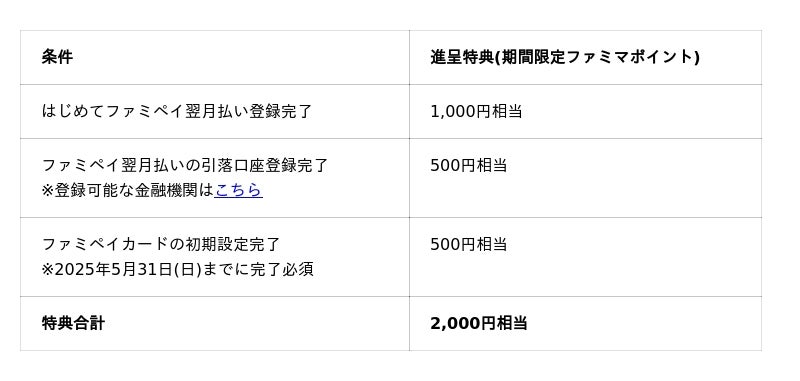 ファミペイ翌月払いの新規登録後、各種設定をすべて完了した場合、合計2,000円相当を進呈します!