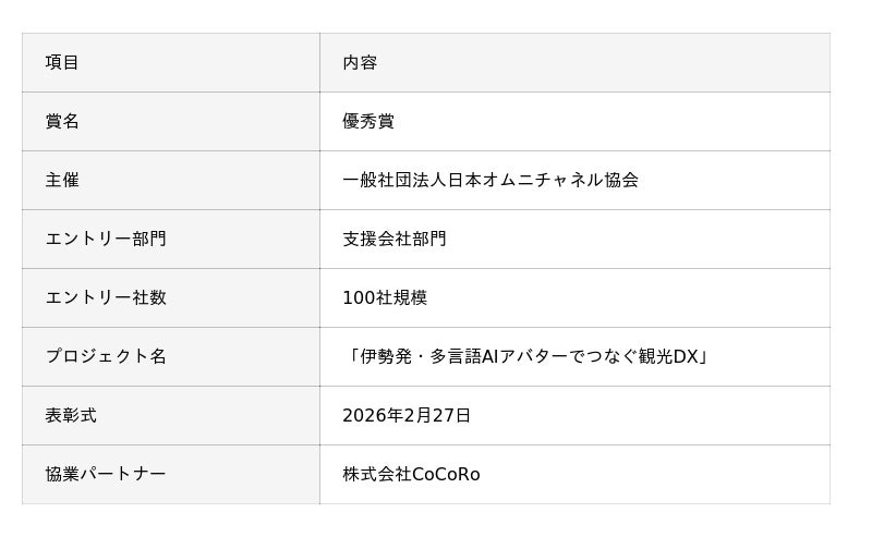 JetB株式会社(本社:東京都新宿区、代表取締役:竹内 勇人、以下「JetB」)は、株式会社CoCoRo(本社:東京都文京区、代表取締役: 清原 正光、以下「CoCoRo」)との協業プロジェクト「伊勢発・多言語AIアバターでつなぐ観光DX」にて、一般社団法人日本オムニチャネル協会が主催する「DXイノベーション大賞」の支援会社部門「優秀賞」を受賞したことをお知らせいたします。