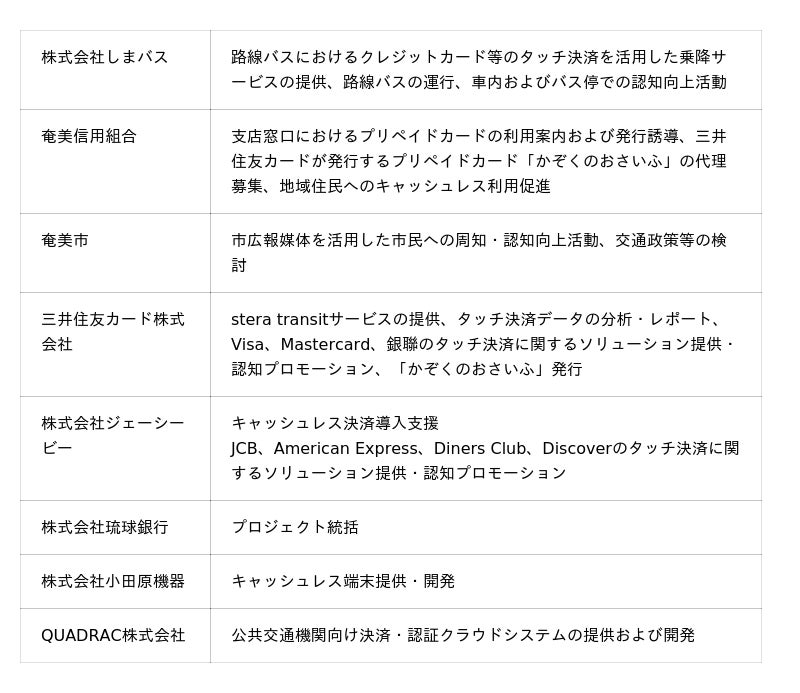株式会社しまバス(本社:鹿児島県奄美市、代表取締役社長:岩崎 勇登)、奄美信用組合(本社:鹿児島県奄美市、理事長:手島 博久)、奄美市(本庁:鹿児島県奄美市、市長:安田 壮平)、株式会社琉球銀行(本社:沖縄県那覇市、代表取締役頭取:島袋 健)、三井住友カード株式会社(本社:東京都江東区、代表取締役 社長執行役員 CEO:大西 幸彦)、株式会社ジェーシービー(本社:東京都港区、代表取締役会長兼執行役員社長:二重 孝好)、株式会社小田原機器(本社:神奈川県小田原市、代表取締役社長:津川 直樹)、QUADRAC株式会社(本社:東京都中央区、代表取締役社長:高田 昌幸)は、2026年3月31日(火)より、官民一体で奄美大島におけるキャッシュレス化推進に向けた取り組みを開始します。