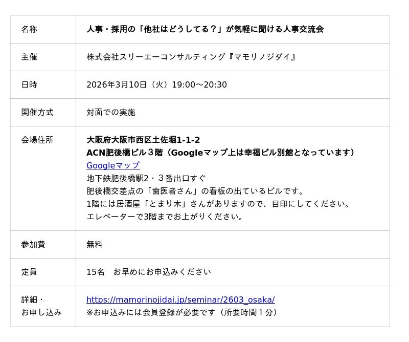 中小企業の守備力を強くするメディア『マモリノジダイ』を運営する株式会社スリーエーコンサルティング(代表取締役社長:竹嶋 寛人)は、2026年3月10日(火)19:00より、大阪・肥後橋にて無料イベント「人事・採用の『他社はどうしてる?』が気軽に聞ける交流会」を開催します。今回のテーマは、「福利厚生、社内制度について」です。