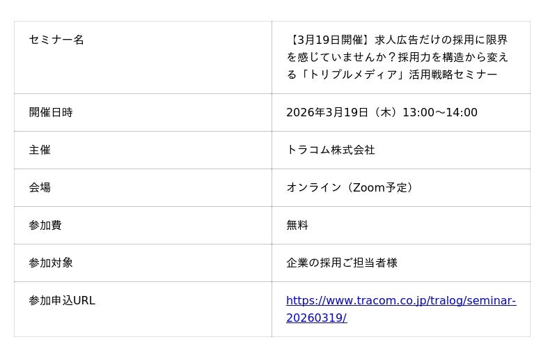 【3月19日(木)開催】採用力を構造から変える「トリプルメディア」活用セミナーをオンライン開催|トラコム株式会社