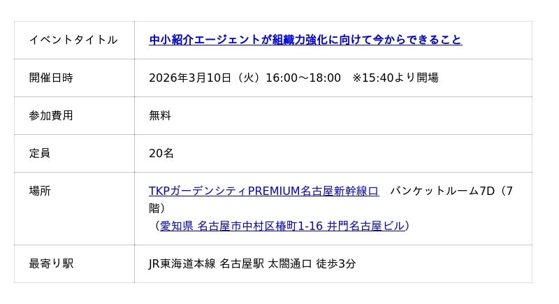 中小紹介エージェントが組織力強化に向けて今からできること」と題した無料のオフラインイベントを2026年3月10日(火)16:00~18:00に名古屋にて開催します。