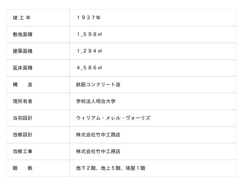 この保存・継承事業は、明治大学創立150周年記念事業として実施し、また竹中工務店が進める歴史的建築物を未来に継承する「レガシー活用事業※」として実施します。