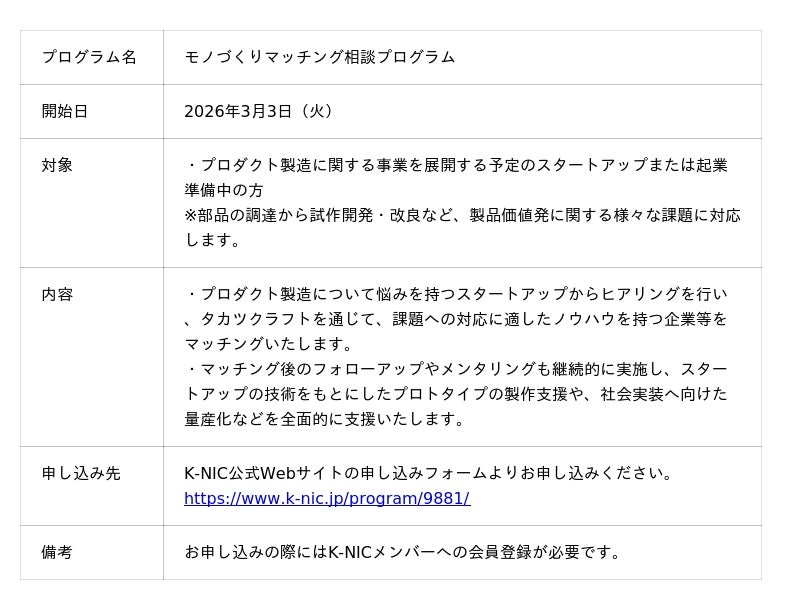 株式会社ツクリエ(本社:東京都千代田区 代表取締役:鈴木英樹 以下、ツクリエ)が川崎市から運営受託するKawasaki-NEDO Innovation Center(所在地:神奈川県川崎市 以下、K-NIC)は、2026年3月3日(火)より、川崎市域の企業体で構成される合同会社「タカツクラフト」と協働し、モノづくりに関する課題を持つスタートアップなどを対象とした新プログラム「モノづくりマッチング相談プログラム」を新規開設します。
