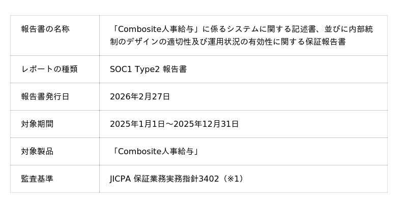 当社が今般受領したSOC1 Type2 報告書は、「Combosite人事給与」に係る内部統制の設計の適切性、ならびに一定期間にわたる運用状況の有効性について、独立した外部の監査法人による評価を受けたものです。