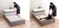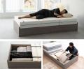 収納方法は、ベッド床面両端の「すのこ板」をめくるだけ。内部は仕切りのないシンプル構造で、かさばる寝具や家電なども形状を選ばず自由に収納可能と、まるでクローゼットのように扱うことができます。