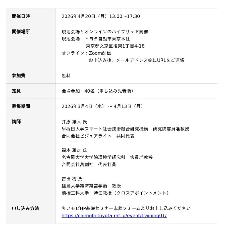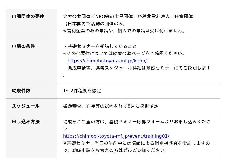 一般財団法人トヨタ・モビリティ基金(理事長:豊田章男、Toyota Mobility Foundation、以下「TMF」)は、その地域で暮らす人々の可能性を広げ、地域の存続と発展を目指した「移動の仕組みづくり」プロジェクトを推進しています。この度2026年度のプログラムの一環として、地域の移動課題に対し「移動の仕組み」を立ち上げたい方を対象に基礎セミナーの開催と、「移動の仕組みづくり」に取り組む自治体やNPO等各種団体の皆様を対象に助成公募を開始します。