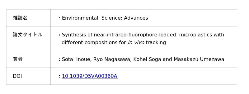 Inoue S, Isobe T, Soga K, Umezawa M: Near-infrared (NIR-II) fluorescent poly(ethylene terephthalate) nano-microplastics for in vivo tracking. Journal of Nanoparticle Research, 28: 5 (2026)