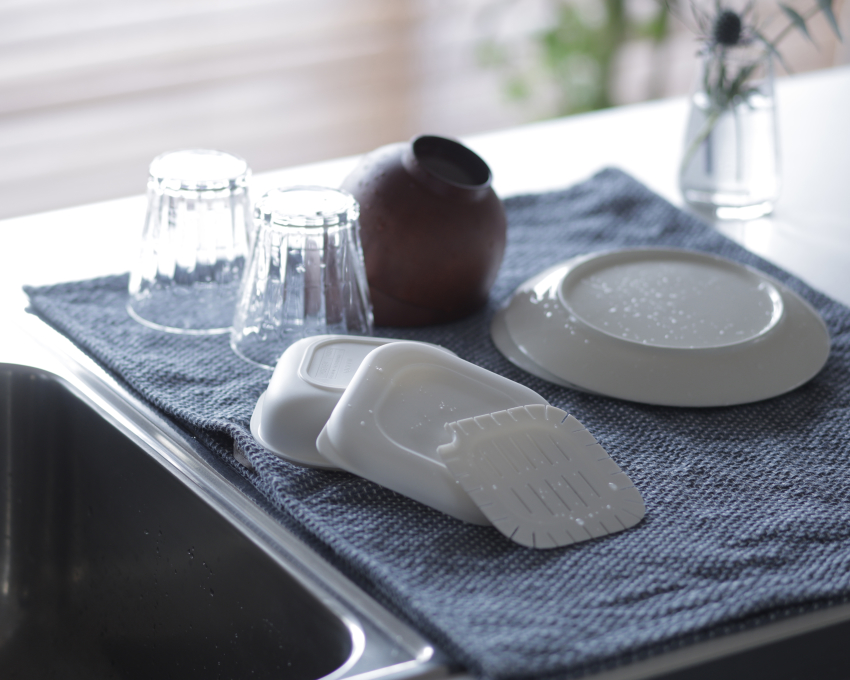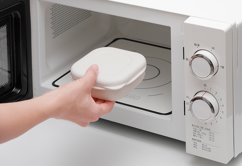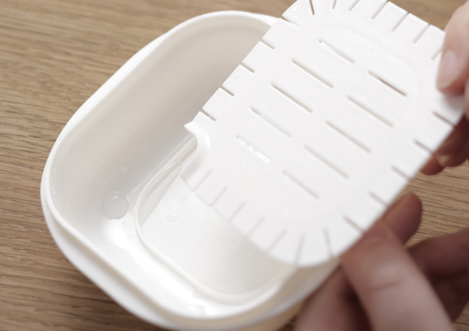 底にセットした「すのこパーツ」の上にご飯を入れるため、温めた際にはスリットから余分な水分が下に落ちて、容器の底のご飯のベタつきを防ぎます。また、薄く角を丸みのある形状にすることで、ムラなくふっくらとご飯を温められるようにしました。角が丸い形状により、ご飯を入れやすく、洗いやすい点も特長です。