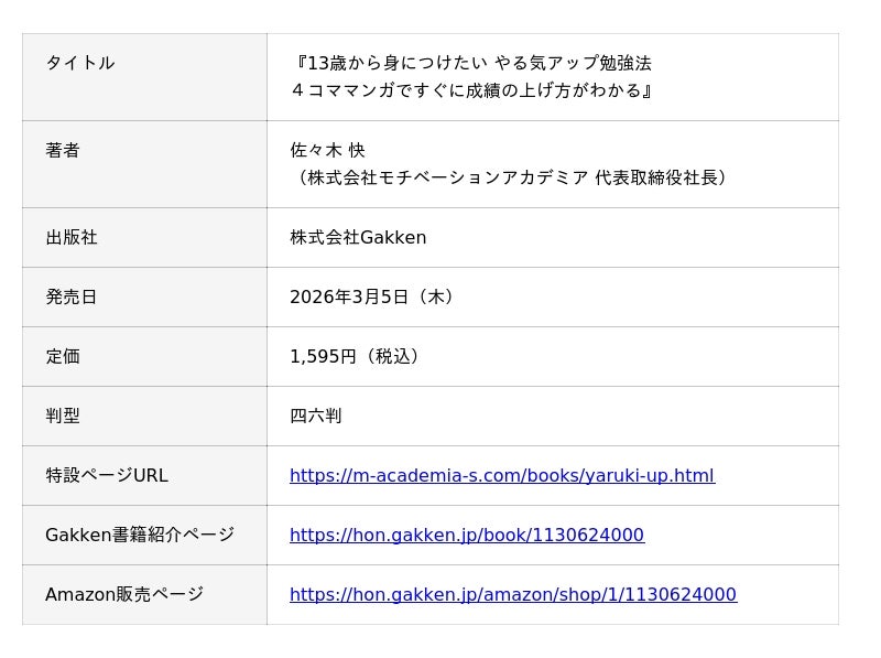 株式会社リンクアンドモチベーション(本社:東京都中央区、代表:小笹芳央、証券コード:2170)のグループ会社で学習塾事業を行う株式会社モチベーションアカデミア(本社:東京都中央区、代表:佐々木 快)は、中高生向けの自学自習メソッド「モチアカ式」を体系化した新刊『13歳から身につけたい やる気アップ勉強法』を、2026年3月5日(木)に株式会社Gakkenより出版いたします。
