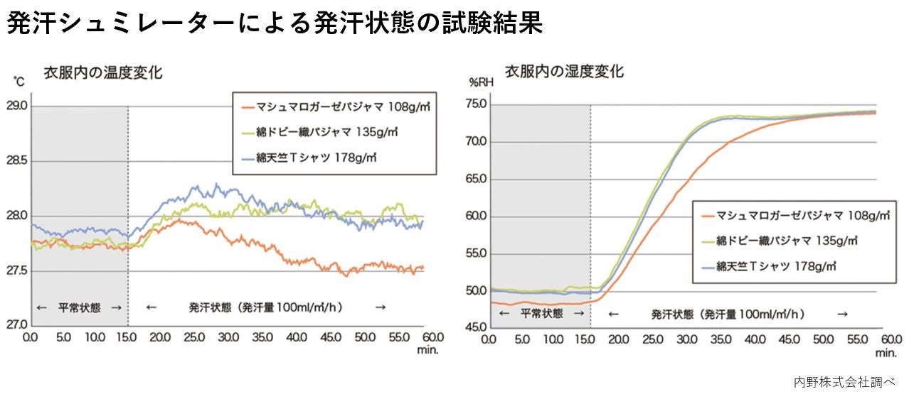 心地よい眠りを妨げる要因として、就寝中に無意識にかいている汗による”ムレ”と”寝冷え”が挙げられます。そこで、マシュマロガーゼの特性を検証するために、パジャマと肌の間の温度と湿度に着目し、発汗シュミレーターによる試験を行いました。マシュマロガーゼパジャマは、比較品よりも衣服内の温度と湿度の上昇を抑えている結果が得られ、衣服内の温湿度を快適に保ち、心地よい眠りをサポートするパジャマということが分かりました。