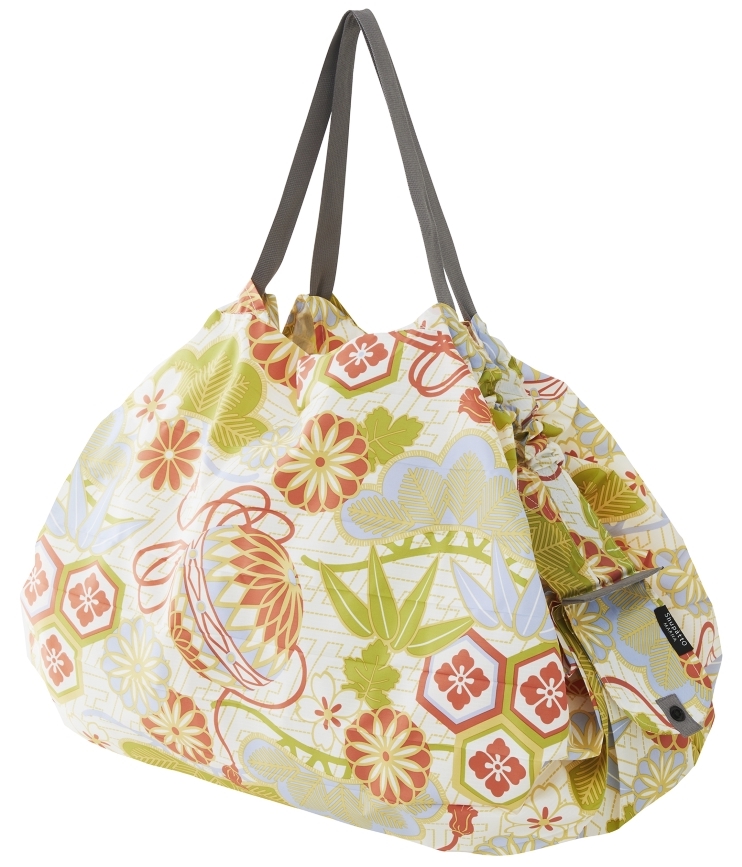 この度の『和 Shupatto コンパクトバッグ L』は、和柄デザインの大容量サイズです。耐荷重は15kg、容量は約40Lでレジカゴ1杯分が収まり、食料品のまとめ買いやかさばるお土産の購入等におすすめです。
