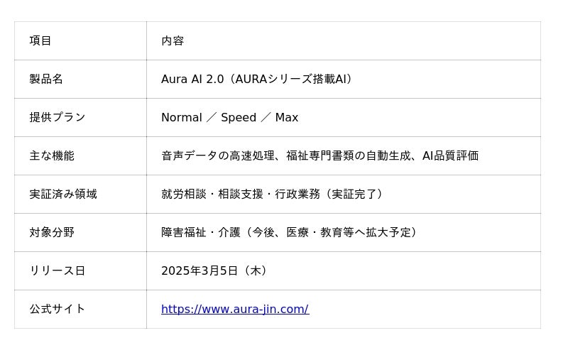 株式会社Jin(本社:東京都品川区、代表取締役:前川友吾)は、AURAシリーズ搭載AI「AuraAI 2.0」を2025年3月5日(木)に正式リリースいたします。AI障害福祉ソフトAURAに搭載されているAIエンジン「Aura AI 2.0 Speed」は、198分(3時間18分)の音声データを最速17.35秒で処理し、書類を自動生成する技術を確立(※1)。ChatGPT・Gemini・Claude・Plaud Note等の主要AIサービスとの比較検証を実施し、音声が30分でも198分でも処理時間が約17秒とほぼ変わらないという、音声の長さに依存しない処理速度を実証しました。障害福祉・介護業界における面談業務のあり方を根本から変革します。