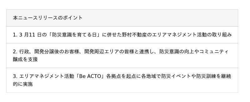 野村不動産の防災の取り組み 地域と伴走するエリアマネジメント活動「Be ACTO」での防災イベント開催と近隣イベントへの協力