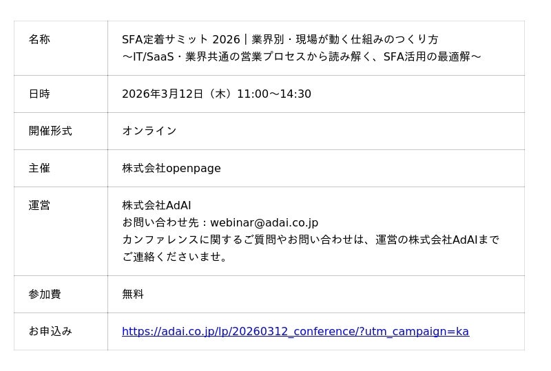 “次の一手”がデータでわかるMA+SFA一体型ツール「Kairos3(カイロススリー)」を提供するカイロスマーケティング株式会社(本社:東京都渋谷区、代表取締役:佐宗 大介、以下「当社」)は、株式会社openpageが主催するオンラインカンファレンス「SFA定着サミット 2026|業界別・現場が動く仕組みのつくり方 ~IT/SaaS・業界共通の営業プロセスから読み解く、SFA活用の最適解~」に、当社取締役 COO 白井 則行が登壇することをお知らせします。